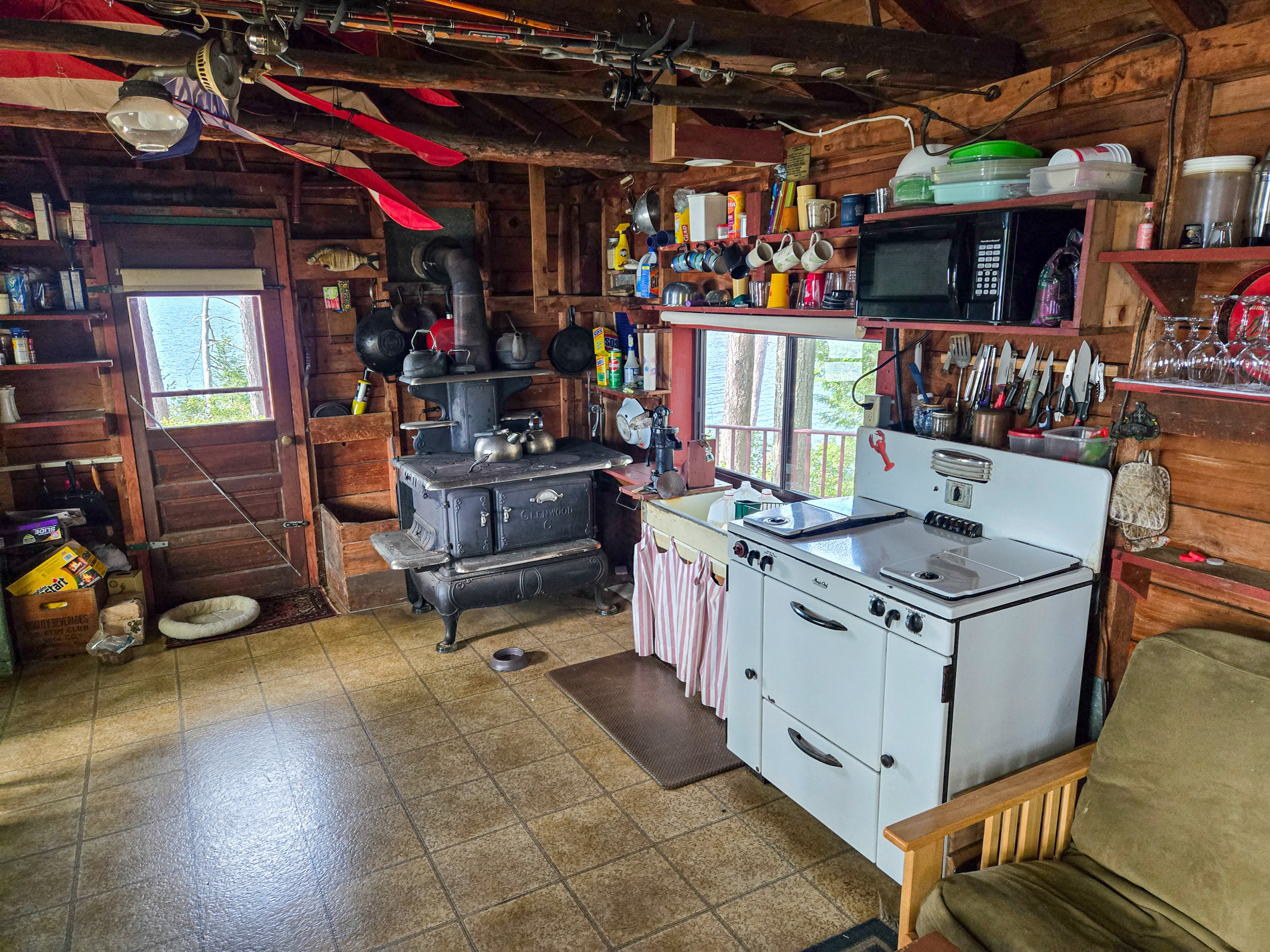 Loon Island Kitchen. No electicity. See the pump on the sink? You pump to get water